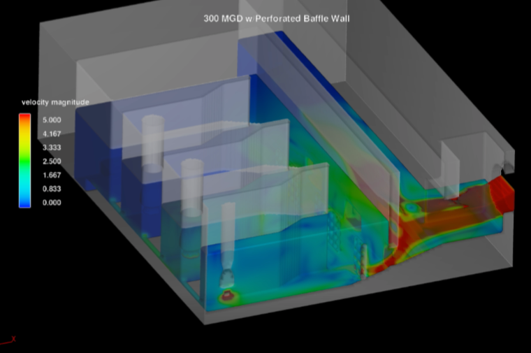 to conduct three dimensional computation fluid dynamic modeling. FLOW-3D is a powerful and highly-accurate multi-physics computational fluid dynamics (CFD) package that we use in-house to conduct analyses on complicated fluid problems that cannot be identified with one-dimensional calculations. This is a specialized tool that can be used for many situations from determining headloss in a complex structure, settling characteristics in a tunnel or tank, determining the effects of baffles in a flow stream, flow tracer in reservoirs or other treatment structures among countless other applications. ASI has utilized the CFD on many projects for our own internal use and specifically on the following projects.